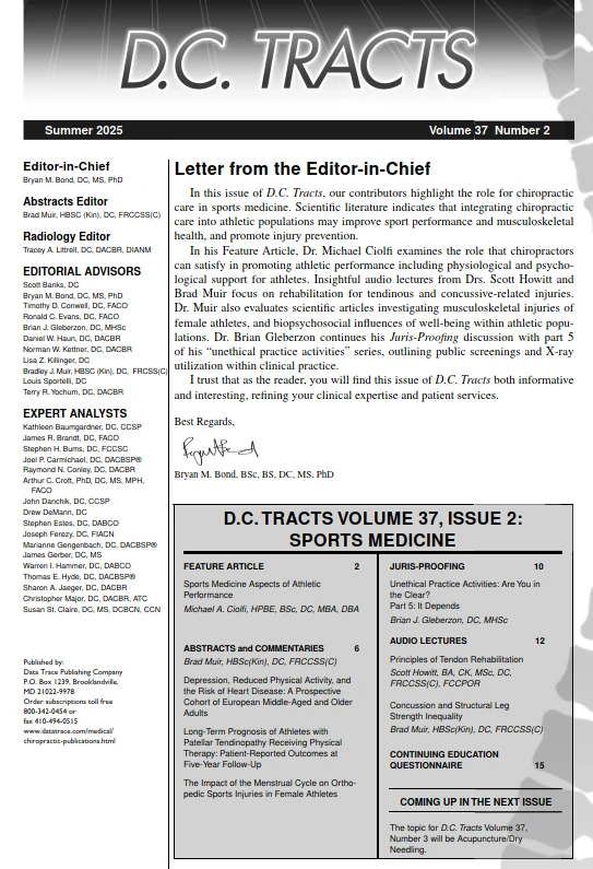 In his Feature Article, Dr. Michael Ciolfi examines the role that chiropractors can satisfy in promoting athletic performance including physiological and psychological support for athletes. Insightful audio lectures from Drs. Scott Howitt and Brad Muir focus on rehabilitation for tendinous and concussive-related injuries. Dr. Muir also evaluates scientific articles investigating musculoskeletal injuries of female athletes, and biopsychosocial influences of well-being within athletic populations. Dr. Brian Gleberzon continues his Juris-Proofing discussion with part 5 of his “unethical practice activities” series, outlining public screenings and X-ray utilization within clinical practice.
